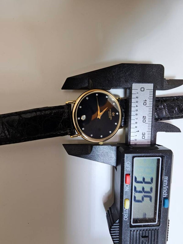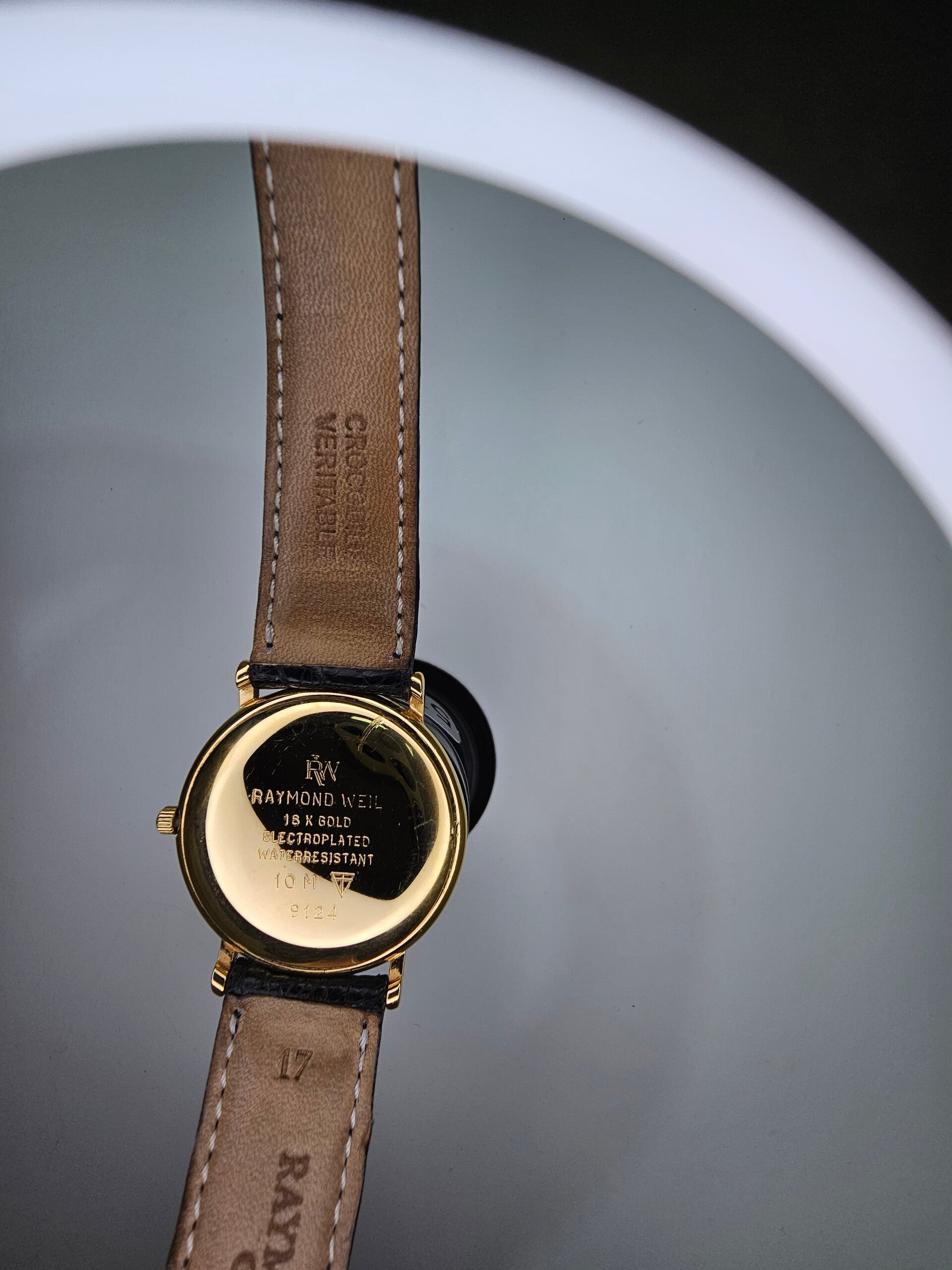 This Raymond Weil Men's Gold-Plated Watch 9124 is a vintage timepiece from the 1990s, featuring a classic round shape with diamond markers on a black dial. The watch has a quartz movement and a date indicator, making it a stylish and functional choice for men, women, or unisex adults. Made in Switzerland, the watch boasts a gold-plated case with a snap caseback, and comes with a black leather strap for a sophisticated look. With its elegant design and Swiss craftsmanship, this Raymond Weil watch is sure to make a statement in any formal or dressy setting.
