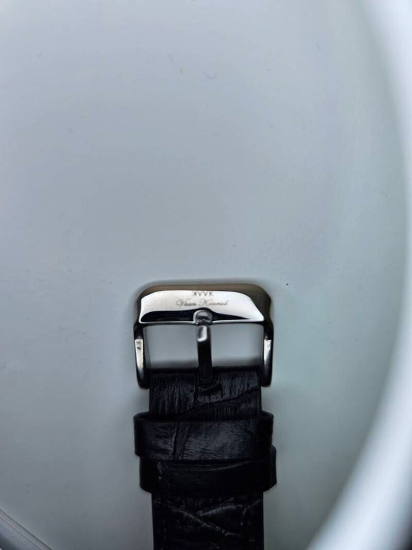 The Vaan Konrad Excession Calendarium Automatic Black Mens Watch is a sophisticated timepiece designed for men. Featuring a genuine leather strap in black, complemented by a stainless steel casing with a silver finish, this watch exudes elegance and style. The self-winding mechanical movement ensures accurate timekeeping, while the sleek round shape and polished case finish add a touch of luxury to the overall design. Perfect for formal occasions, this watch is a timeless accessory for any adult gentleman's wardrobe.